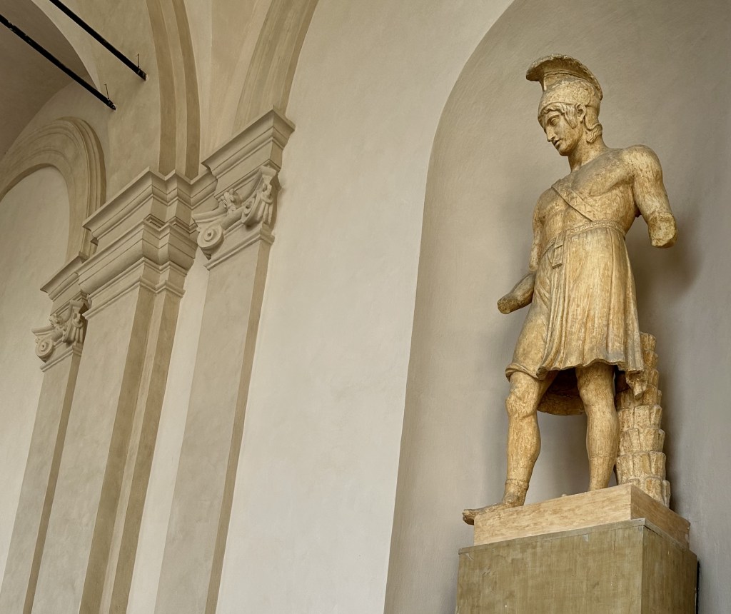 Lt. Col. Di Aria pointed out the fact that in the recurring arch-and-pillar design all three types of Classical Greek columns (Corinthian, Doric, and Ionic) are present in the Ducal Palace structure. Various aspects of paintings and sculpture were addressed and other than the large portraits of multiple generations of royalty most artwork pertained to military genre. A number of the rooms contained many types of military memorabilia including flags, medals, portraits, and uniforms. An array of flags from different eras are displayed, including the families Estense and Savoy, plus the Napoleonic. An interesting comment from the colonel pertained to “The Blue Sash” of special distinction with the color symbolizing the color of the inside of the cloak of the Virgin Mary. Certainly, this is a very foreign concept to myself which if properly researched could prove quite interesting.